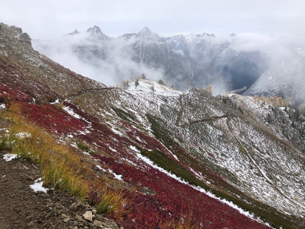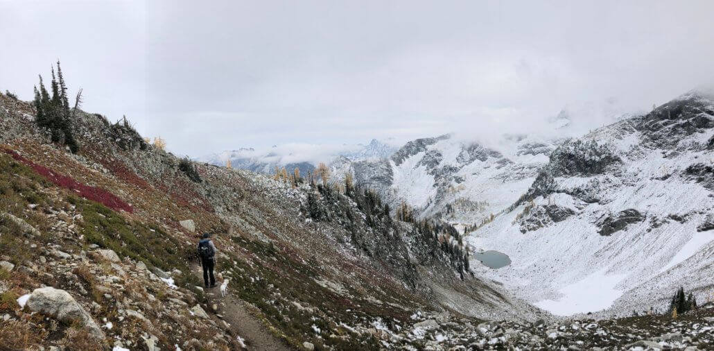 While I love hiking at Mount Rainier National Park, I may love the North Cascades slightly more. Some of my favorite hikes I’ve ever done have been in this park. While this hike would be great in spring, summer or fall season, fall season may be the most popular. October 2018 I was finally able to experience the larches! I hope to make this hike a tradition every fall season because it’s so pretty. It snowed slightly the night before this year. At first, I was a little disappointed because the snow covered the fall colors slightly. However, looking at my pictures after the hike, it made for some great shots!