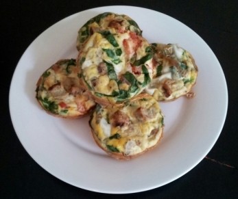 Place whipped eggs in a bowl and chop up veggies, sausage, and sun-dried tomato. Grease your muffin tin then pinch a small amount of spinach, sun-dried tomato, onion, sausage link, cheese and pepper into each tin. Pour in eggs until each muffin tin is 2/3 full.