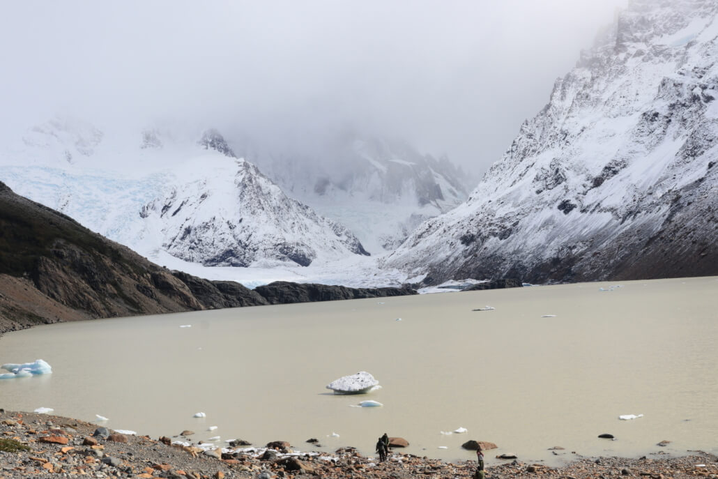 The weather slowly started to clear up, but we still experienced typical Patagonia weather – wind, rain, snow, sun. When we first arrived at the lake, it was completely fogged in. We headed back towards El Chaltén and about 15 minutes later, it stopped snowing & the sun was trying to shine through the clouds. We took our lunch & tea break & decided to head back to Laguna Torre to see if the views improved. Unfortunately, Cerro Torre was still mostly covered with clouds, but we were able to see the bottom third of the mountain.